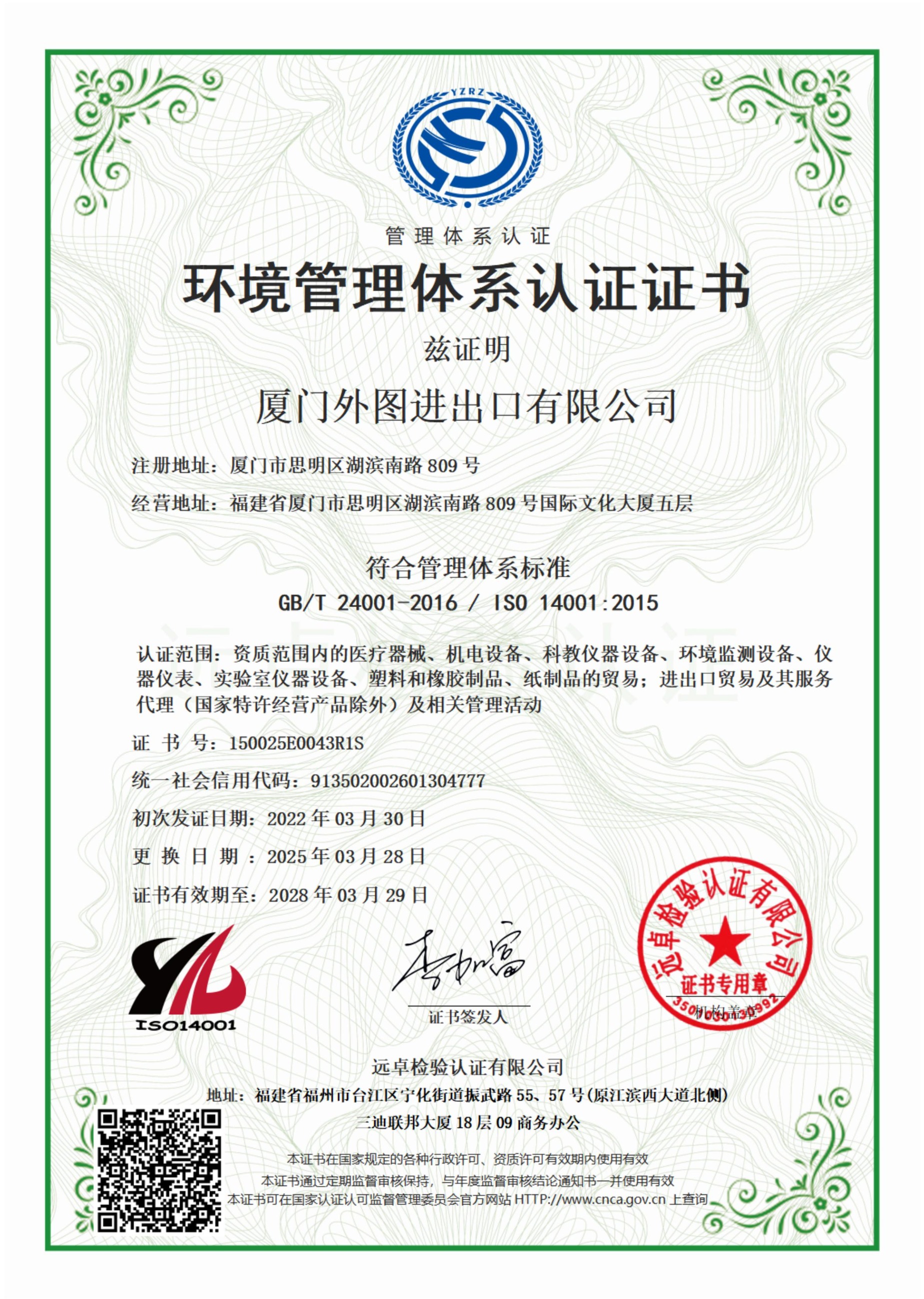 环境管理体系认证证书