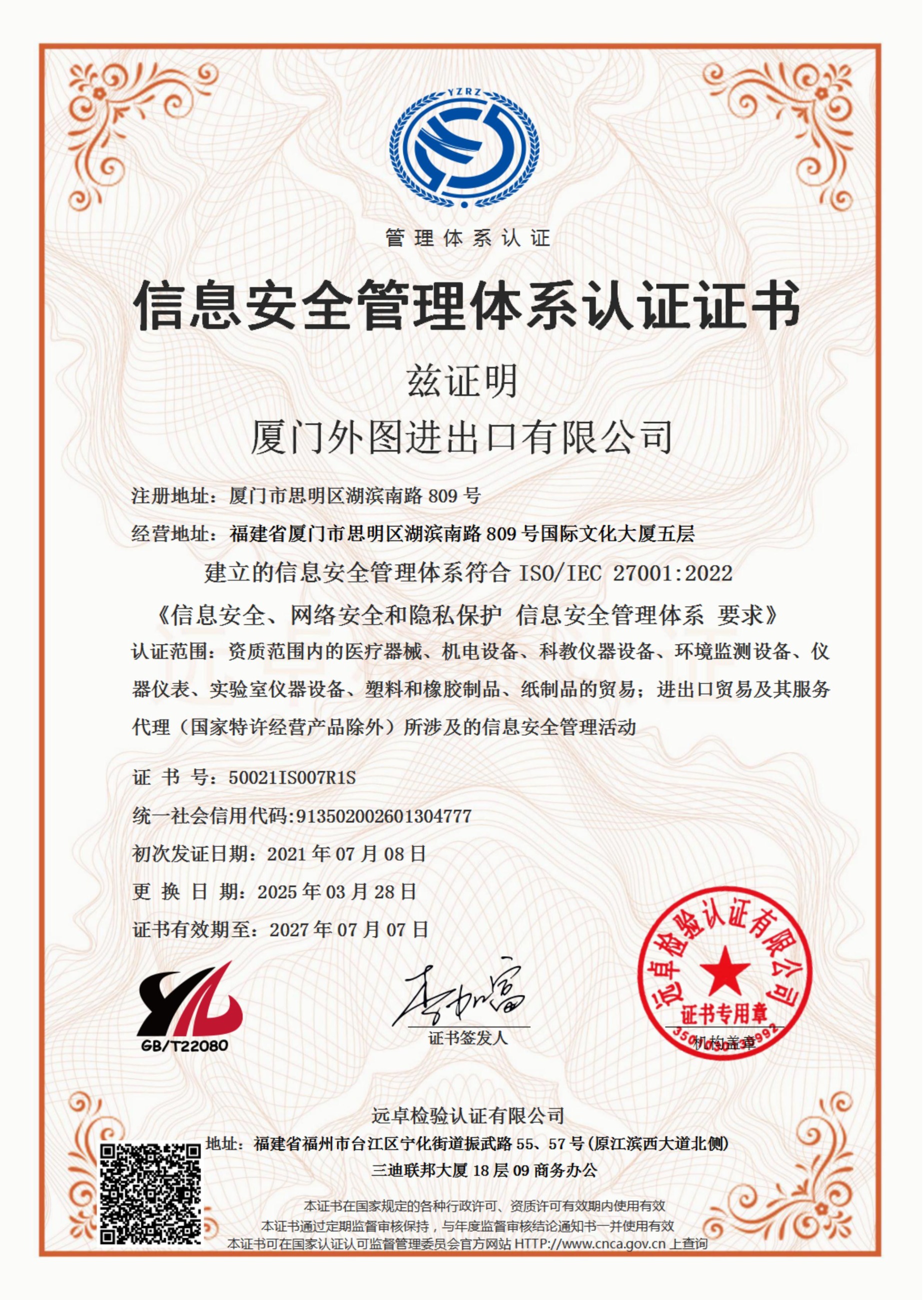 信息安全管理体系认证证书